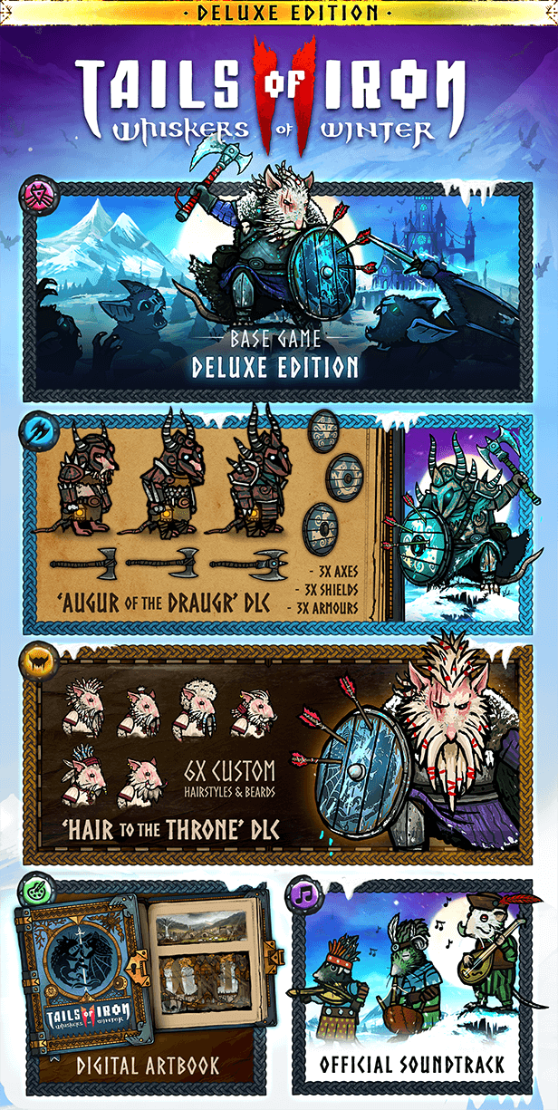 Tails of Iron 2: Whiskers of Winter jest dostępne na PC (Steam, EPIC), PS4, PS5, Xbox Series X|S, Xbox One i Nintendo Switch. Na Steamie do 11 lutego gra jest dostępna 20% taniej w cenie 79,99 zł, później będzie to kwota 99,99 zł. Deluxe Edition (poniżej rozpiska zawartości w formie grafiki) to obecnie 95,99 zł. Jeżeli ktoś jeszcze nie zna świata Ratdomu to może rzucić okiem na pakiet zawierający obie części.