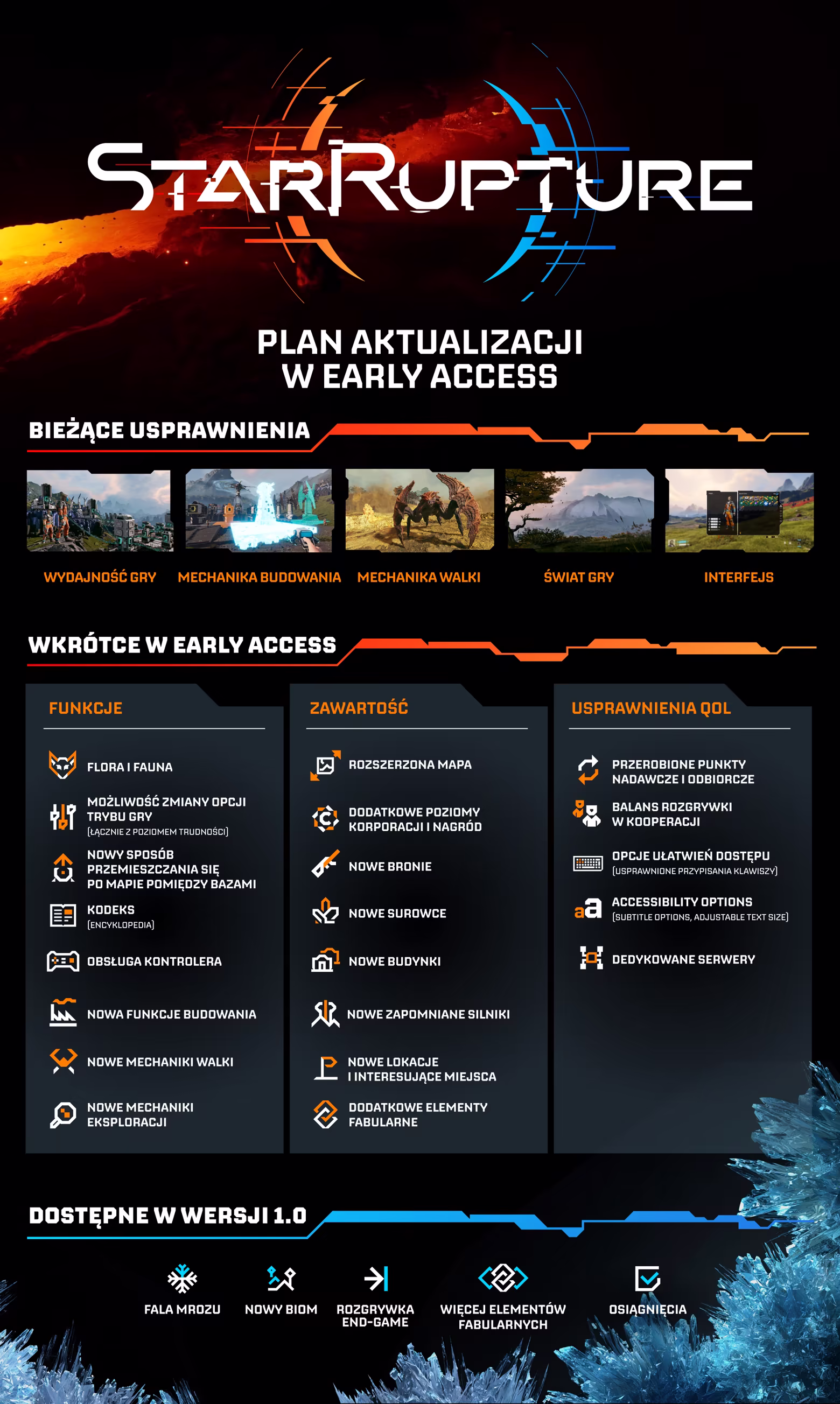 Już teraz gracze mają do dyspozycji wiele surowców, budynków oraz spory obszar do zbadania. Ponieważ to dopiero wczesny dostęp to należy oczekiwać błędów i niedociągnięć. Twórcy na bieżąco pracują nad usprawnieniami. Poniżej ilustracja, która ukazuje co jeszcze czeka na graczy w przyszłości. Wolicie chłodniejsze klimaty? Spokojnie, będą fale mrozów.